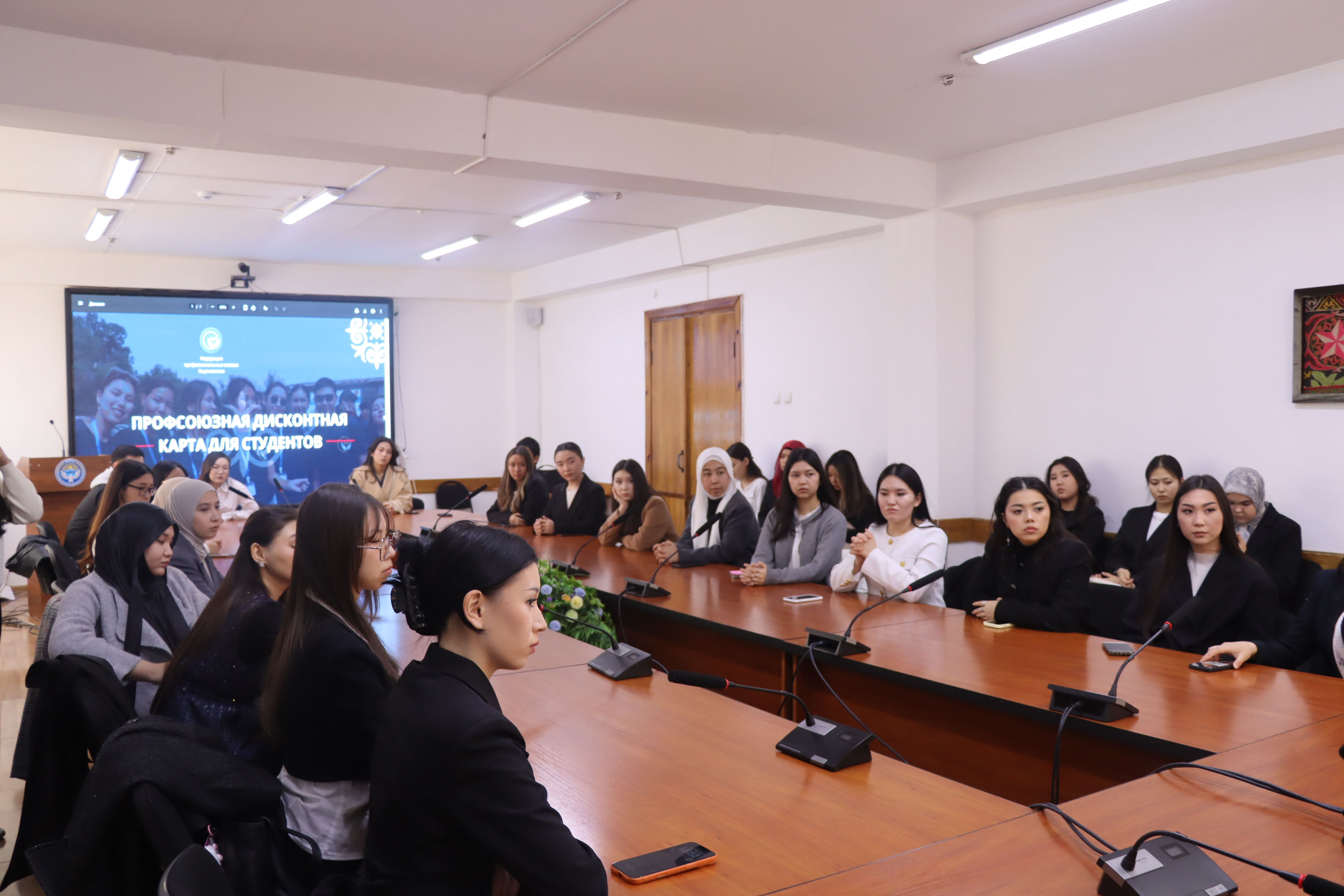 Также студентам была представлена информация о профсоюзной дисконтной карте, разработанной специально для них. В пилотном формате проект запускается в БГУ и позволит студентам получать скидочные бонусы в более чем 400 организаций. Стоит отметить, данный проект реализуется совместно с общественным объединеним “Молодежное движение Кыргызстана”.
